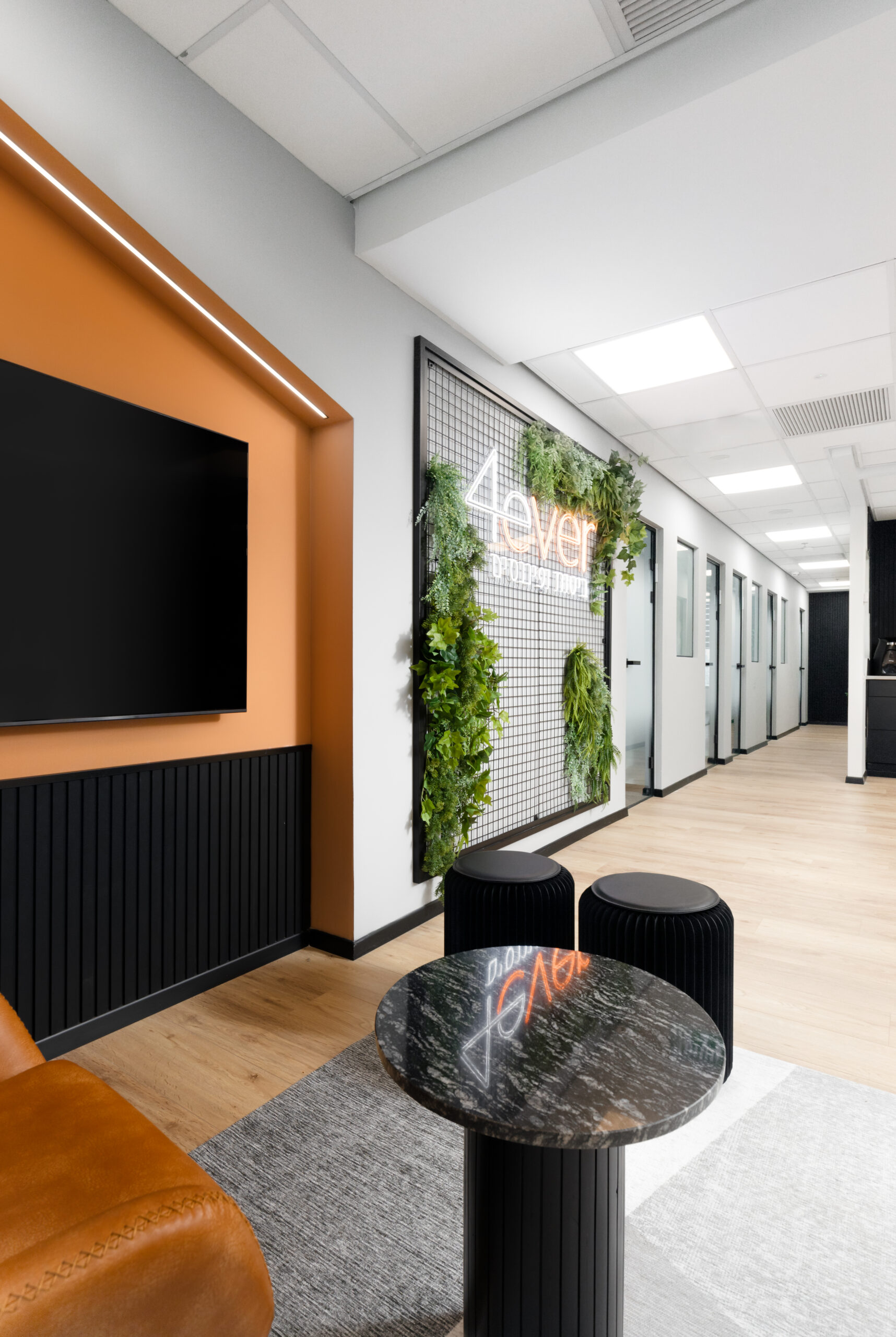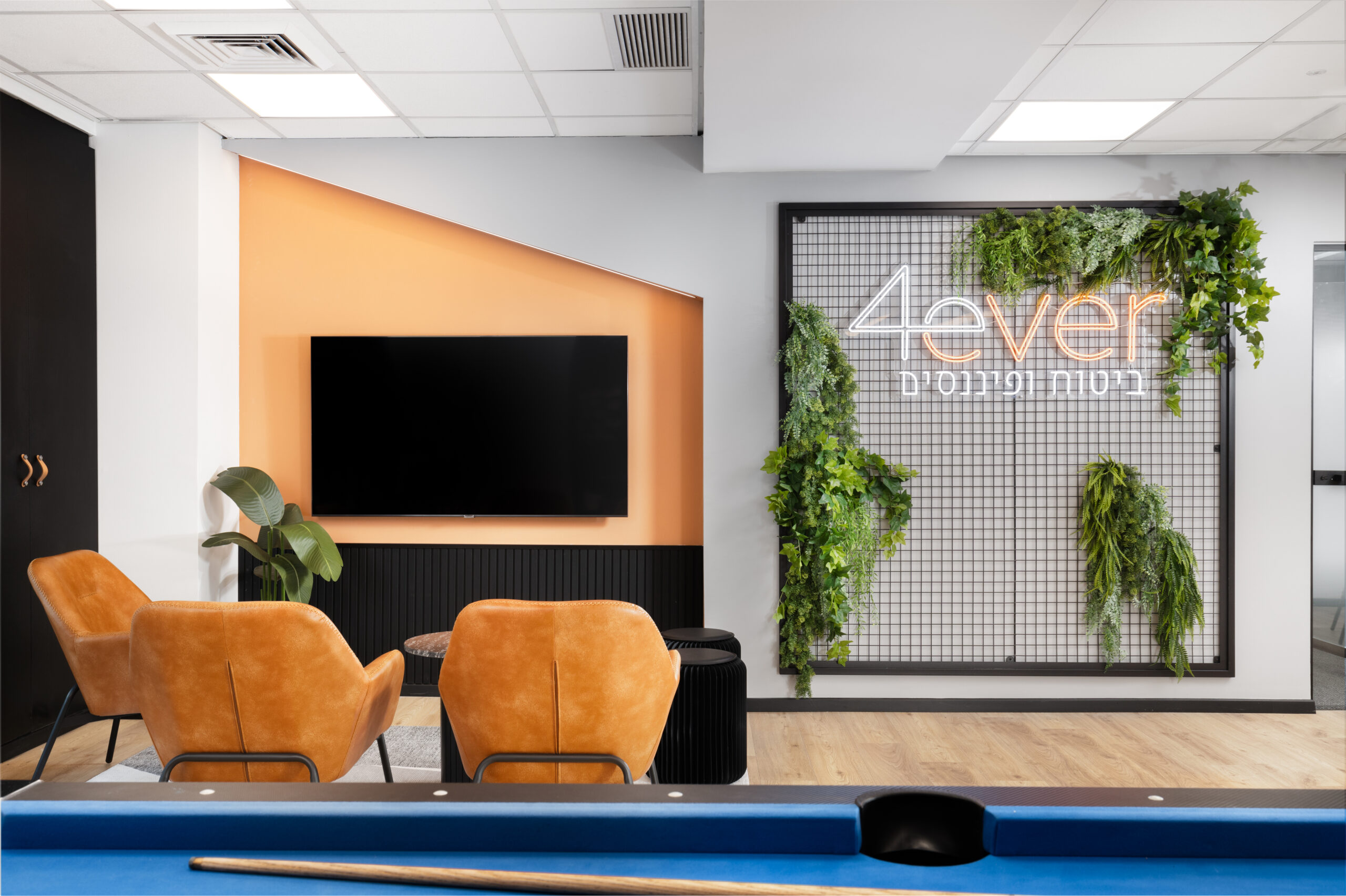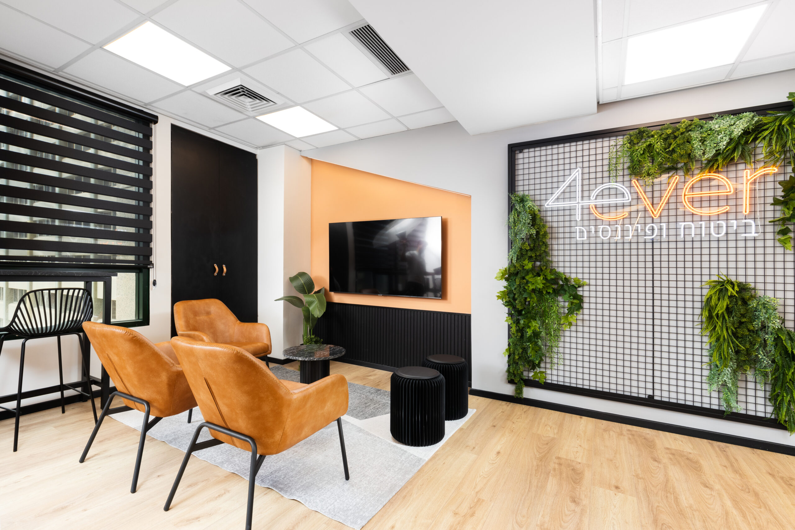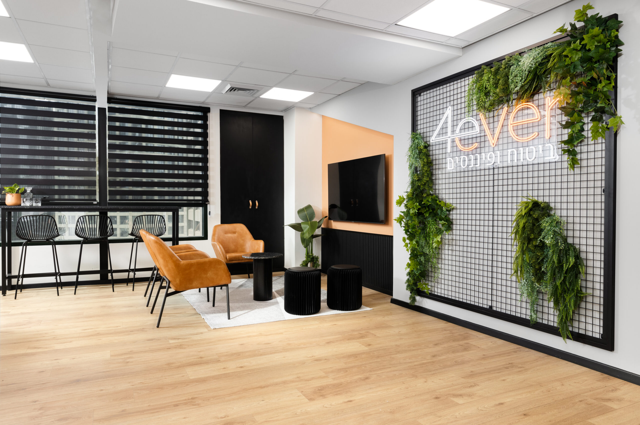 קונספט: המשרד עוצב בסטייל של לופט גברי ומרשים. בתכנון ועיצוב המשרד התחשבנו בצבעוניות המותג וצורניות הלוגו, אשר היווה לנו השראה לעיצוב כולו. תוכלו להבחין בכך בנגרות הייחודית – השימוש המרומז במספר 4 בדלפק ובקיר הכוח בחלל הלאונג’. גווני הלוגו והמותג חוזרים גם בקירות המשרד, בריהוט ובאקססוריז.